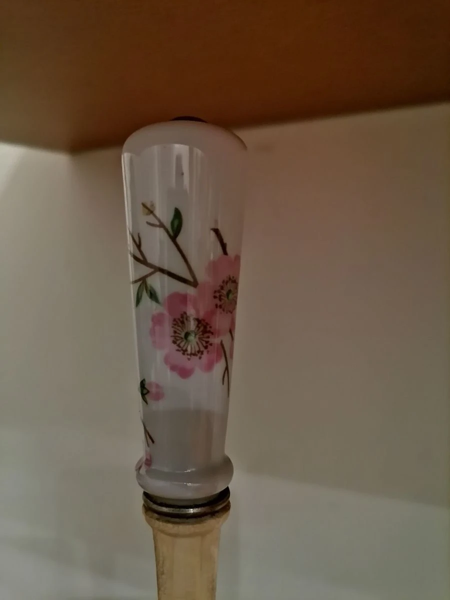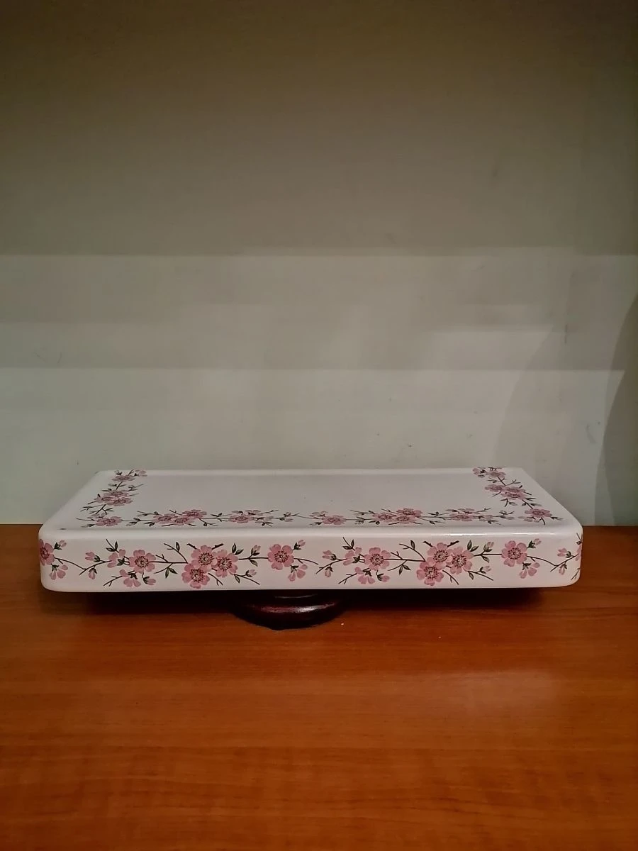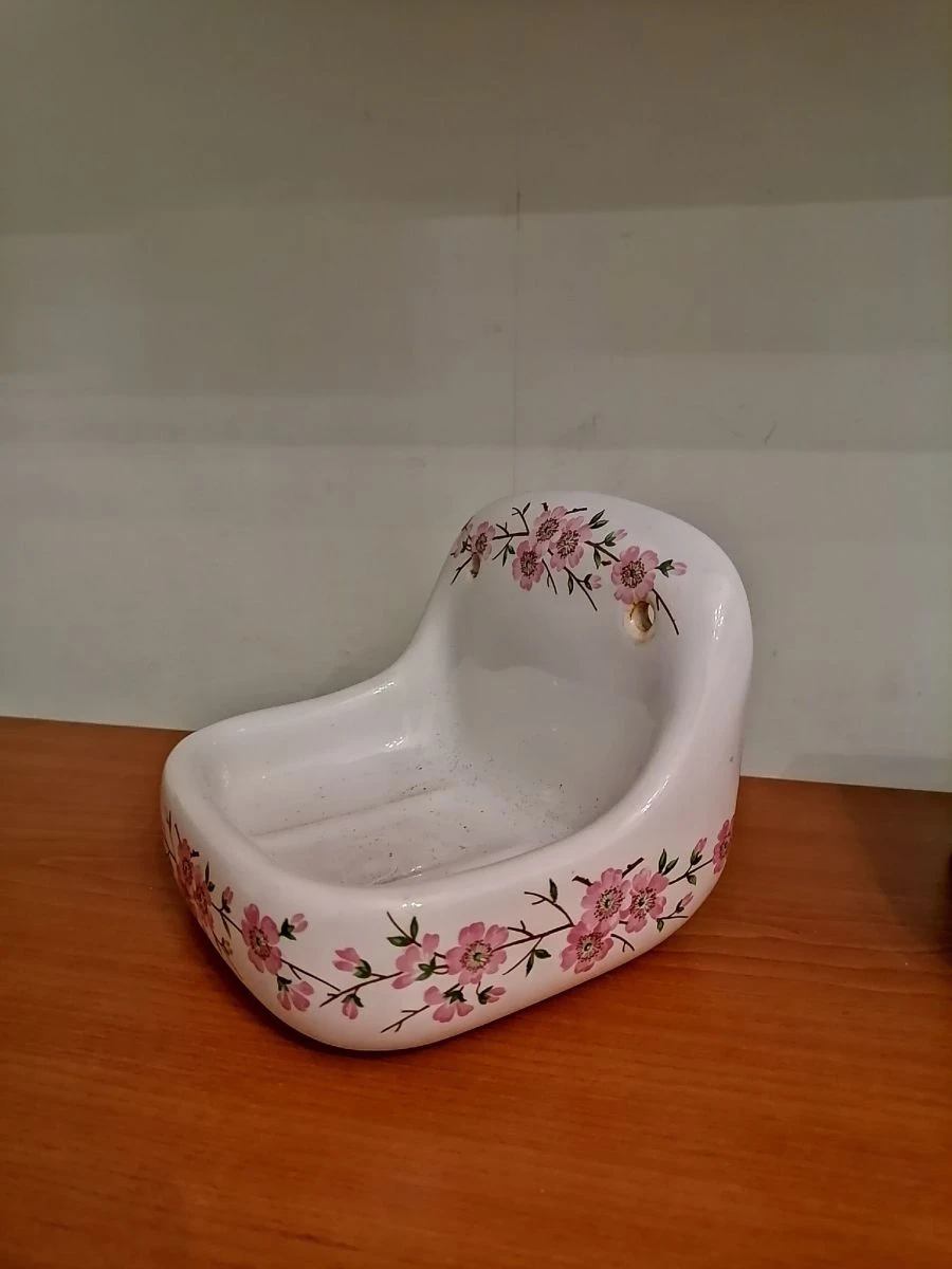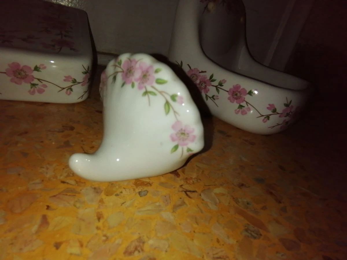 Γαλλικής κατασκευής πορσελάνη με ζωγραφική χειρός, πολυτελή αξεσουάρ μπάνιου ή για wc, porcelaine de paris (επώνυμος γαλλικός οίκος από το1773), 7 τεμάχια σε άριστη κατάσταση – σχέδιο ζωγραφικής : άνθη σε αποχρώσεις του ροζ (ύφος ρομαντικό). Εταζέρα 30χ12, 2 ποτήρια – και για οδοντόβουρτσα, σαπουνοθήκη επιτοίχια 10χ10, άγκιστρο πετσέτας σε σχέδιο κοχύλι, υποδοχέας με βουρτσάκι λεκάνης – πορσελάνινη λαβή. Διατίθενται και τα πορσελάνινα καλύμματα για τις βίδες στήριξης ώστε να είναι αθέατες. Προσφέρεται ως δώρο το μπρούτζινο κουτί-θήκη για χαρτομάντηλα διακοσμημένο με ανάγλυφο τριαντάφυλλο