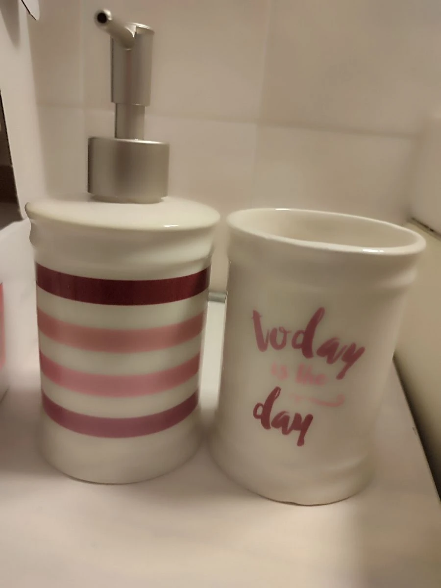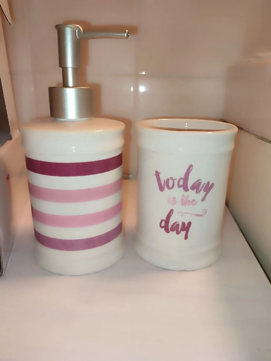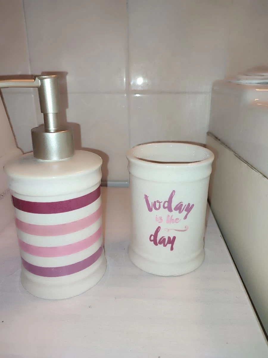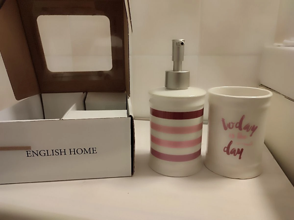 Σαν καινούργια στο κουτί τους English Home δεν έχουν χρησιμοποιηθεί ποτέ, ποτηράκι και ντισπενσερ σε άριστη κατάσταση σε ροζ απόχρωση