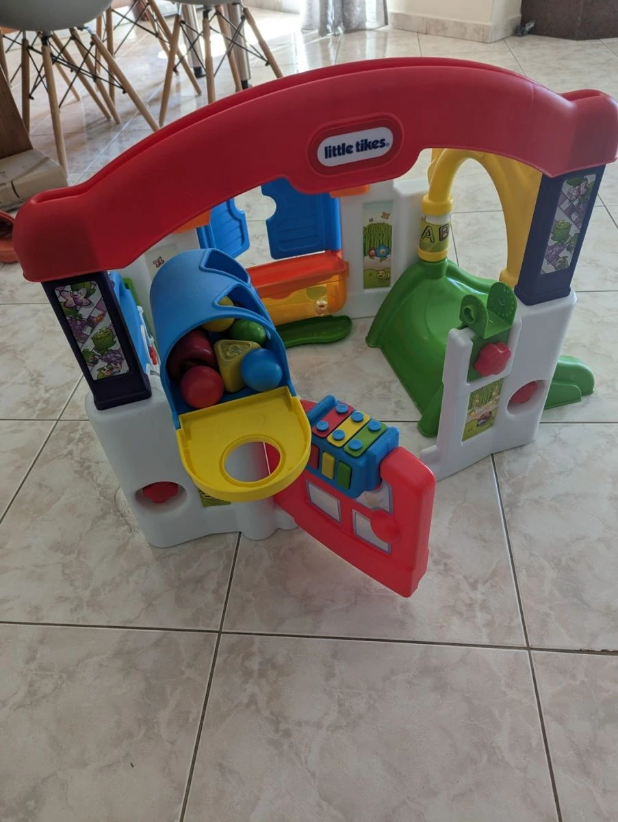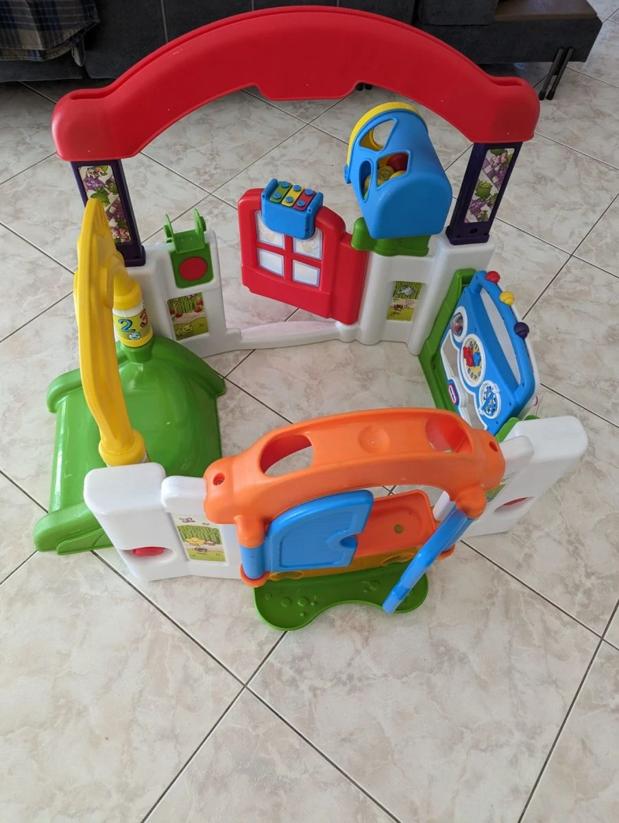Σπιτάκι Δραστηριοτήτων με διπλό περιβάλλον παιχνιδιού που περιλαμβάνει χώρο για μπουσούλημα ανάμεσα στην αψίδα και την τσουλήθρα, διαδραστικό τηλέφωνο, παιχνίδι με τηλεσκόπιο, παιχνίδι με τα σχήματα και τις μπάλες!