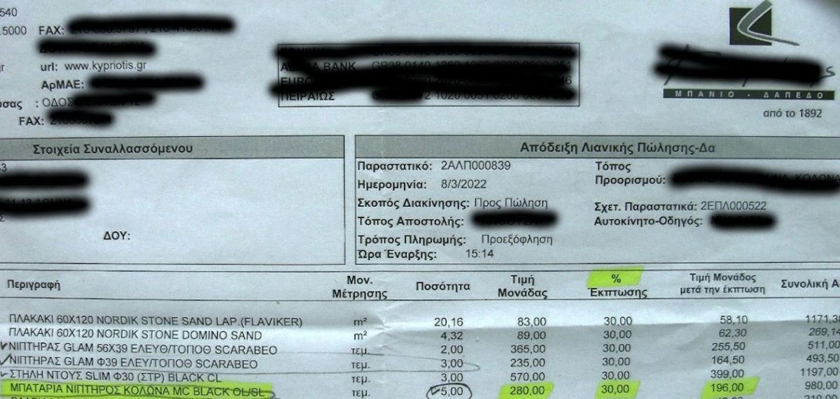 Κόστος αγοράς ανά μπαταρία, χωρίς ΦΠΑ και μετά από 30% έκπτωση: 196€ (τα προσωπικά στοιχεία του προμηθευτή έχουν σκόπιμα μουτζουρωθεί στη φωτογραφία του παραστατικού αγοράς).