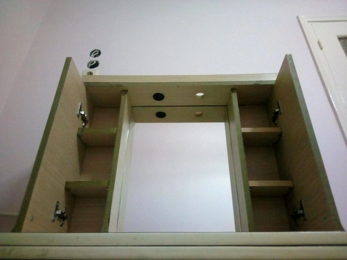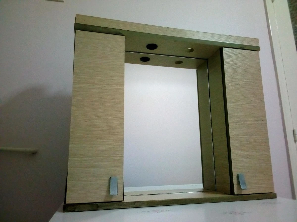 Ορθογωνιος καθρεφτης μπανιου με δυο ντουλαπια με ραφια και υποδοχες δυο λαμπτηρων. Διαστασεις 70*50*15 εκατοστα.