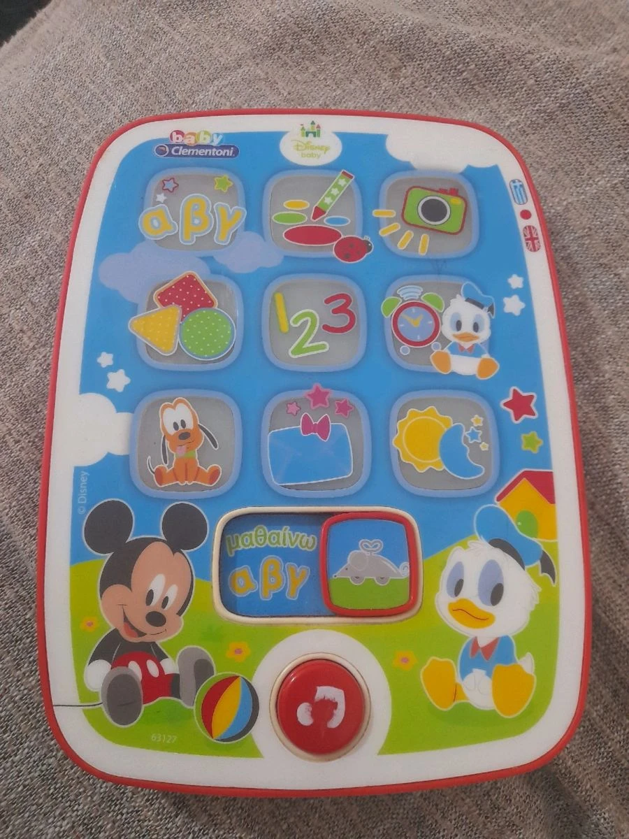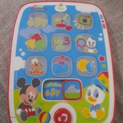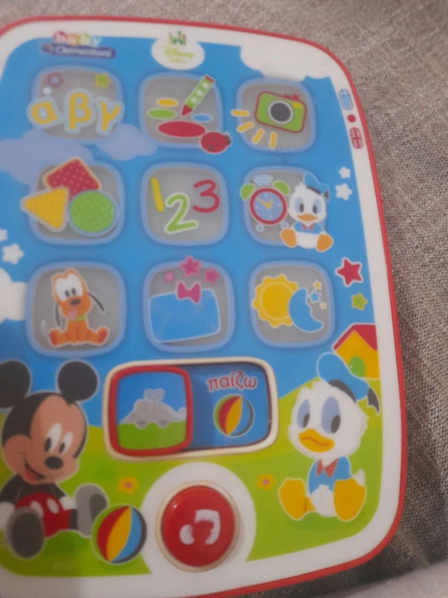 παιχνιδάκι για παιδιά έχει κουμπιά για την αλφαβήτα για τα χρώματα επίσης για φωτογραφίες σχήματα τους αριθμούς ήχους κάποια σκυλάκι. και επίσης έχει μέρα και νύχτα για να το πατάς και να σου λέει αν είναι μέρα ή νύχτα αλφαβήτα μαθαίνω και παίζω επιλέγεις ένα από τα δύο τι θέλεις και επίσης έχει και θέλετε ελληνικά ή Αγγλικά και μπαίνουνε τρεις μπαταρίες μεσαίες επίσης είναι για όλες τις ηλικίες και είναι από την Disney επίσης είναι πολύ ωραίο μικρό σαν tablet και βγάζει ήχους έχει ένα κουμπάκι που είναι σαν σχήμα μουσικής και το πατάς και βγάζει τους ήχους