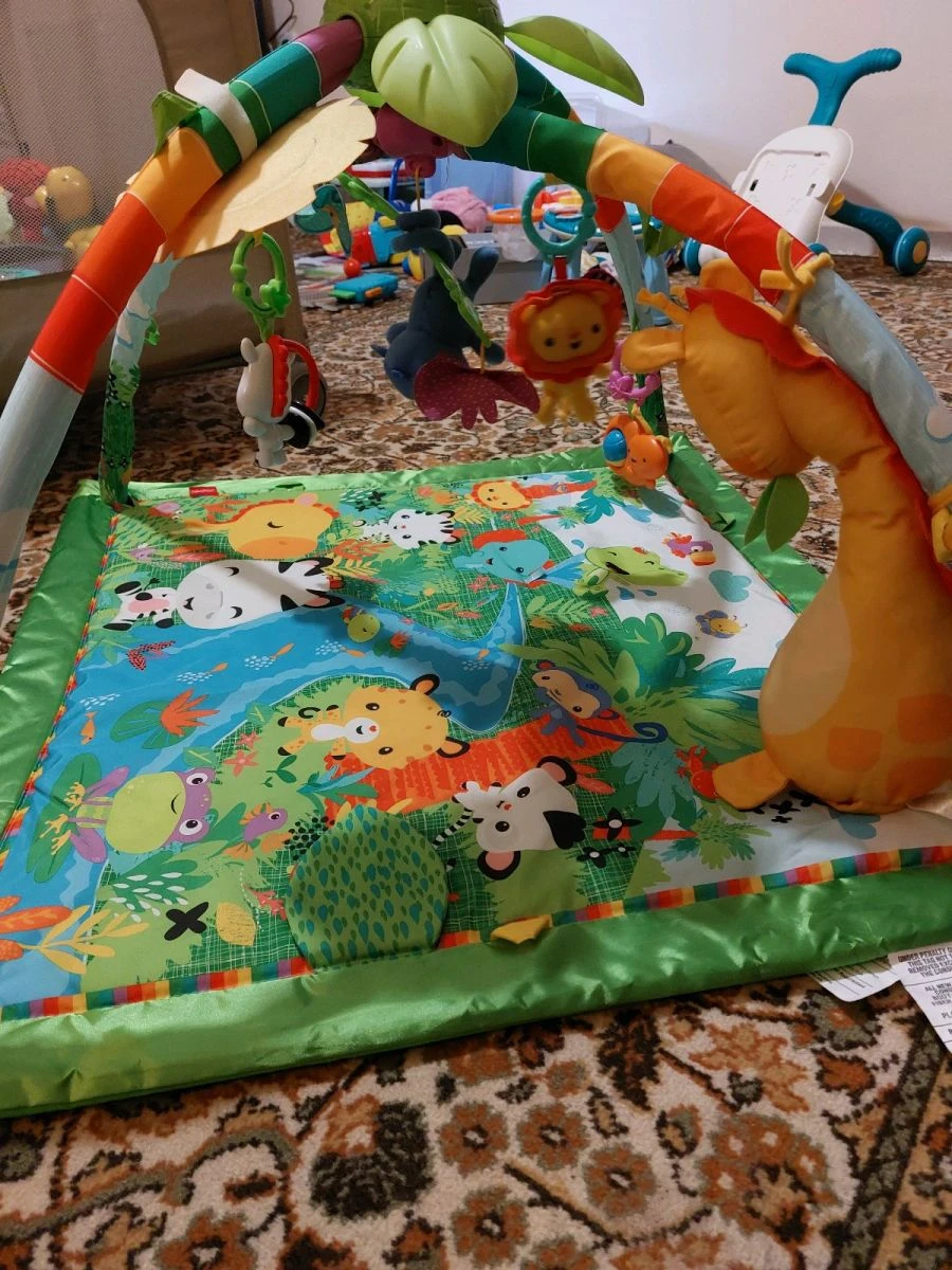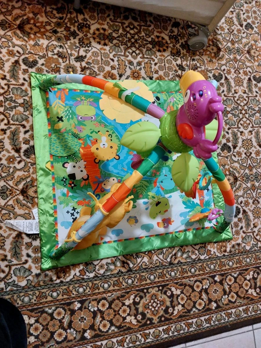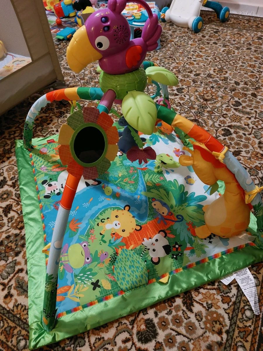 μεγάλο γυμναστήριο με διαφορετικες υφες και ομορφα εντονα χρώματα,με μουσικό παιχνίδι παπαγάλο που βγαινει για να το κρατάει το παιδακι και αισθητηρα κίνησης ,κρεμαστά με διάφορες υφές, καθρέφτη ασφαλείας, πλήρως λειτουργικό. εμείς το ευχαριστηθηκαμε μέχρι τον 9ο μήνα.