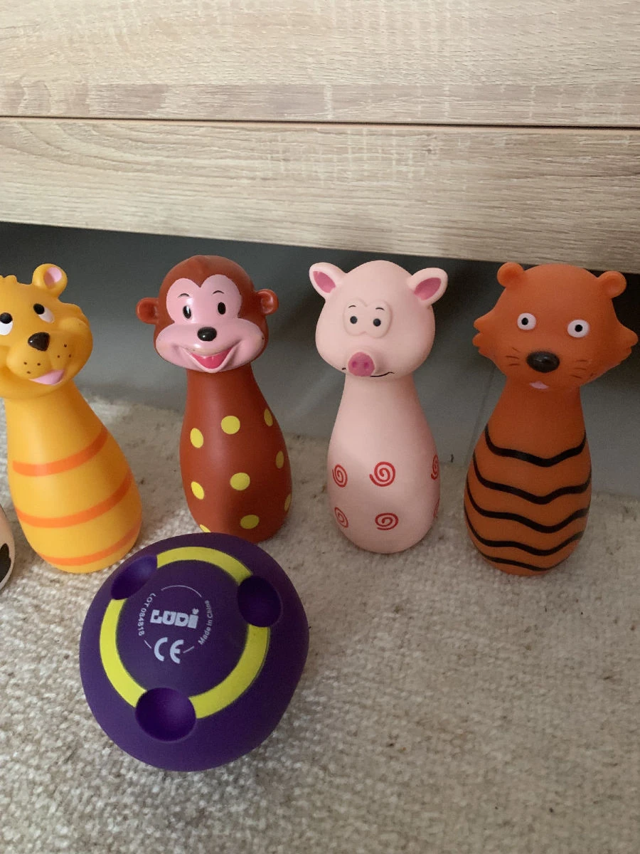 Ξύλινα φρουτάκια , αυτοκίνητο με σχήματα, ξυλόφωνο, παιχνίδι bowling με ζωάκια. Όλα 23ευρω.