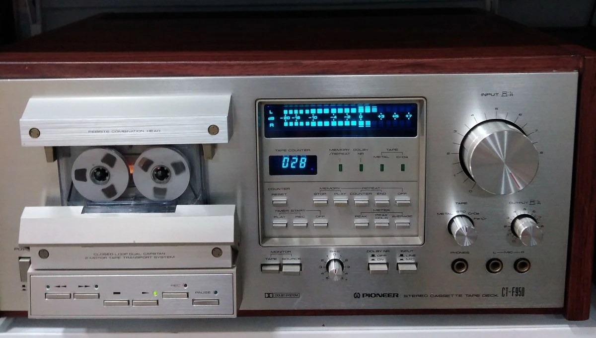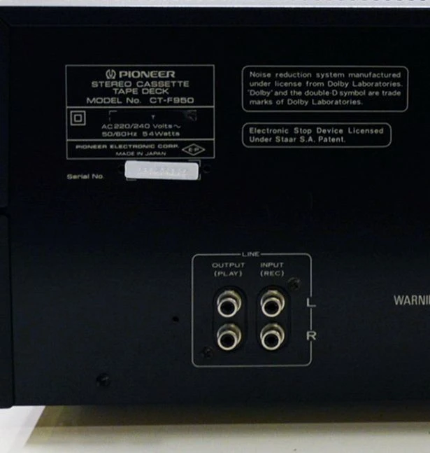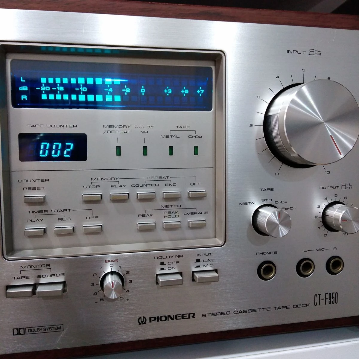 The Pioneer CT-F950 is a 2-channel, stereo compact cassette recorder featuring a 3-head system with combination record/playback head, bias control mechanism, microprocessor control and Dolby noise reduction.