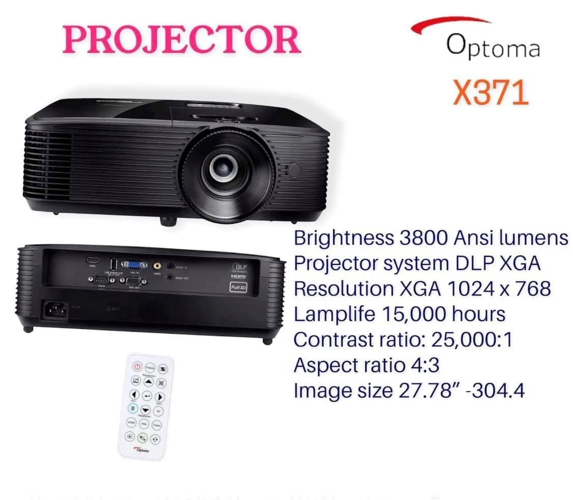 Optoma X371 Projector προτζέκτορας, σφραγισμένος, καινούριος, εγγύηση επίσημης ελληνικής αντιπροσωπείας, απόδειξη αγοράς από μεγάλη αλυσίδα, Υποστήριξη περιεχομένου 3d, μέγιστο μέγεθος εικόνας 305 ίντσες!! αντίθεση 25.000:1, Φωτεινότητα 3800 Ansi Lumens, Τεχνολογίας Προβολής DLP (DMD) με Φυσική Ανάλυση 1024 x 768, χρώμα μαύρο. Υπάρχουν 2 τεμάχια.