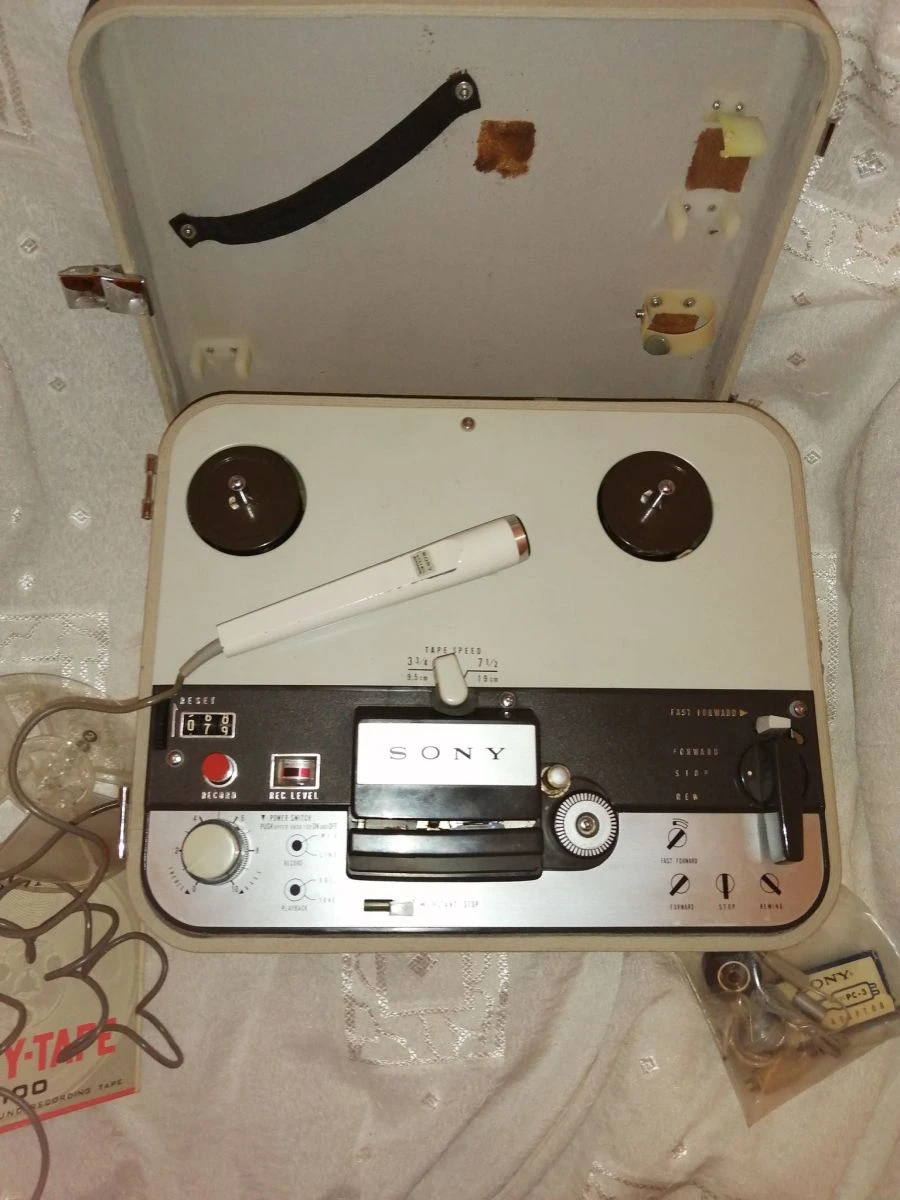 Φορητό reel to reel Sony tape recorder tc-102a του 1965 από την Αμερική. Από τα πρώτα της Sony. Δουλεύει με καρούλια και έχει 2 ταχύτητες 7 1/2 και 3 3/4. Δίνεται με το γνήσιο μικρόφωνό του και με μερικά καρούλια επίσης. Είναι ελάχιστα χρησιμοποιημένο.