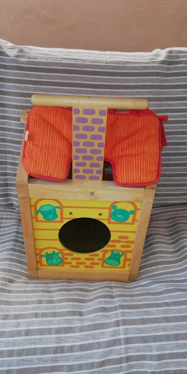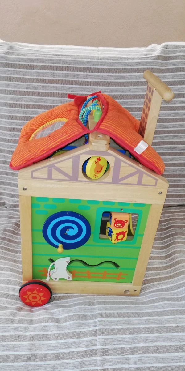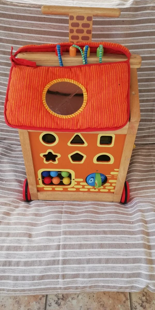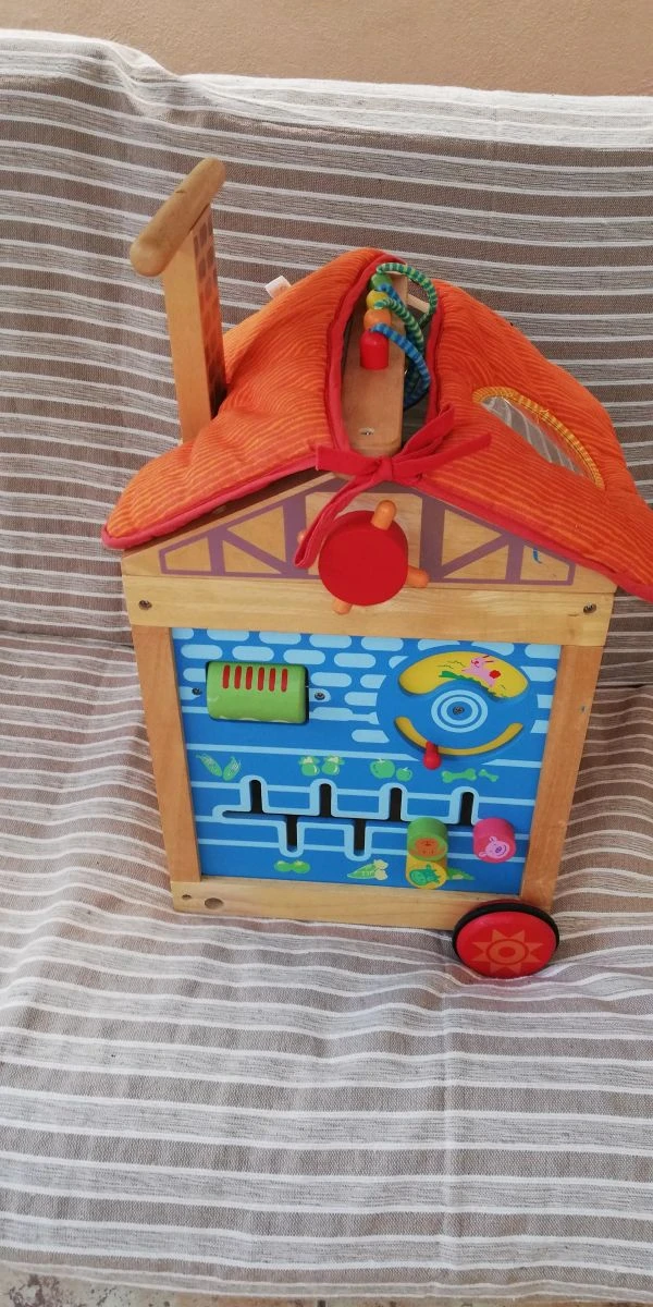 Ξύλινο σπιτάκι με πολλές βρεφικές δραστηριότητες . Λείπουν οι 2 ρόδες από την μία πλευρά αλλά το παιδί μπορεί να το σύρει κανονικά κρατώντας το από την λαβή